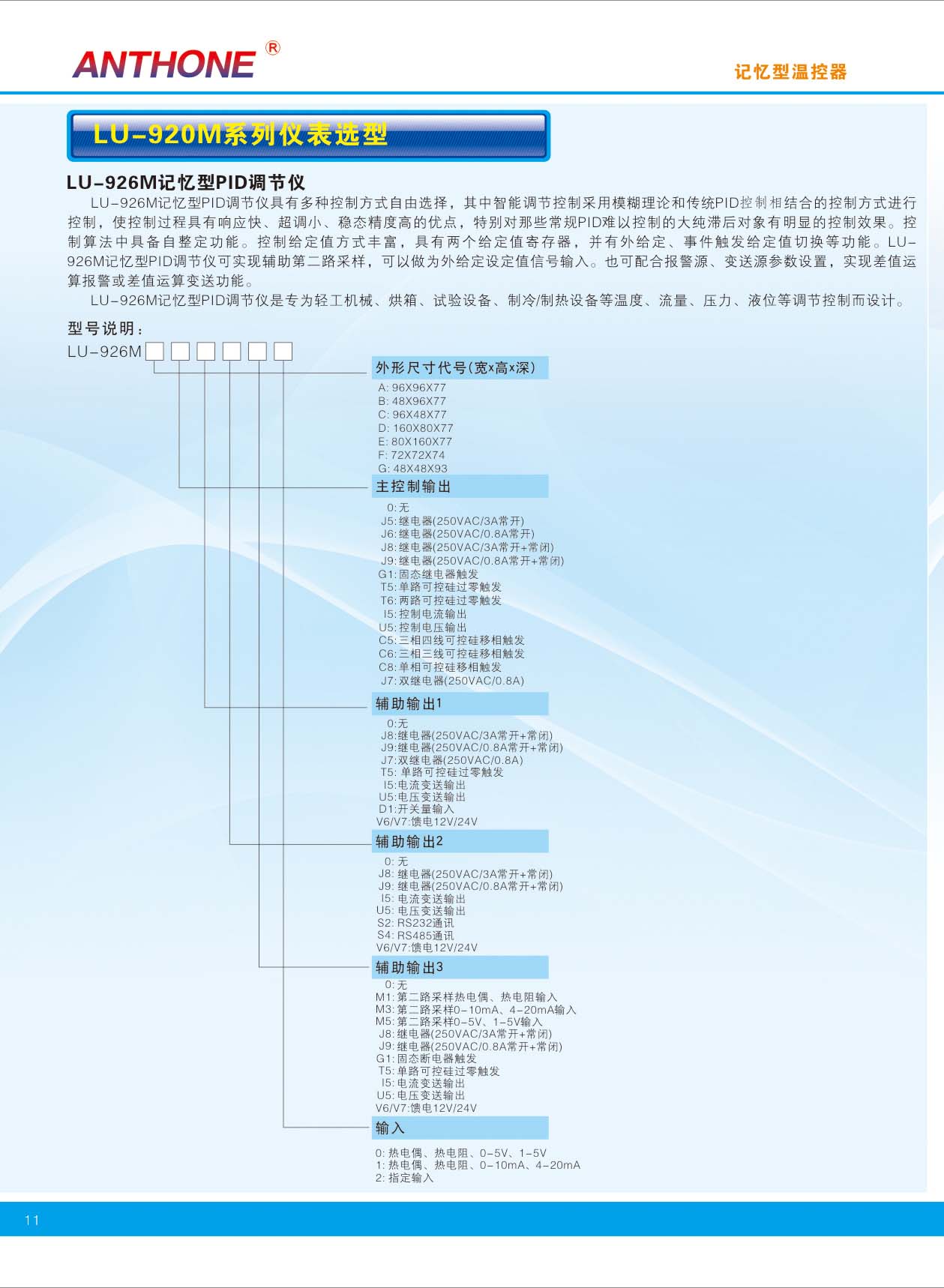 LU-926M智能調節(jié)儀是一種采用全新設計理念的高性能、高可靠性智能型工業(yè)調節(jié)儀表。專為輕工機械、烘箱、試驗設備、制冷/制熱設備等溫度、流量、壓力、液位等調節(jié)控制而設計