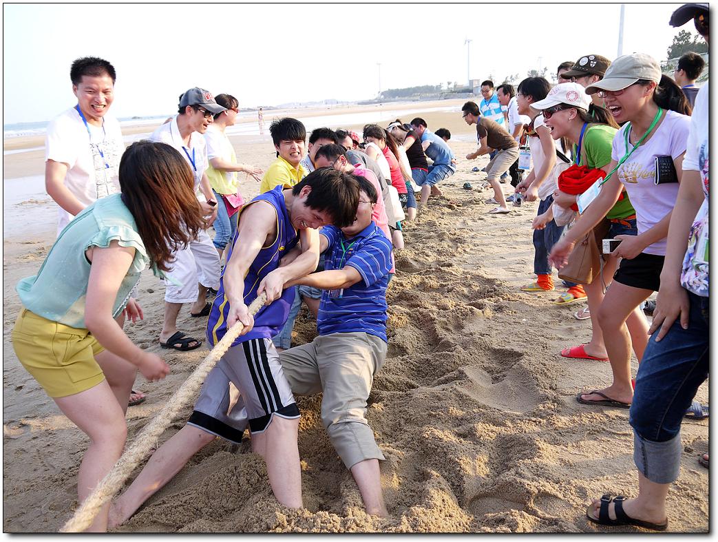 在30分鐘中之后,同事都把自己的帳篷搭好了。正是夕陽(yáng)西下,海水一會(huì)兒波濤洶涌,一會(huì)又風(fēng)平浪靜,復(fù)雜多變不但沒(méi)有影響同事們的游興,反而讓大家見(jiàn)識(shí)了與平時(shí)不般的海灘夜景,同事們有的一時(shí)迎風(fēng)去浪,一時(shí)展臂潛游,不亦樂(lè)乎。幾分鐘過(guò)后,大家也都收拾好心情準(zhǔn)備接下來(lái)的拔河比賽了。終于輪到我們組上場(chǎng)了,我們的對(duì)手是第三組。王經(jīng)理把參加比賽的隊(duì)員按照從高到矮的順序排好,隨著裁判的一聲令下,比賽開(kāi)始了。只見(jiàn)隊(duì)員們雙手一前一后,緊緊地攥住繩子,雙腳分開(kāi),用力蹬著地,身體向后傾斜著,一邊有節(jié)奏地高喊“一、二!一、二!”,一邊共同用力拉繩子。我們組的拉拉隊(duì)員一邊大喊著“加油!加油!”,一邊用手勢(shì)指揮著隊(duì)員們用力。只見(jiàn)繩子一會(huì)兒被我們拉過(guò)來(lái),一會(huì)兒又被對(duì)方拉過(guò)去,僵持下去。就在這關(guān)鍵時(shí)刻,我們趁著對(duì)方放松的一瞬間,一把奪過(guò)繩子,我們贏了,進(jìn)決賽。在決賽我們面臨的強(qiáng)大的二組隊(duì)員,在前面我們都耗用了太多的體力,所以在決賽我們就一局輸贏。決賽開(kāi)始了,隊(duì)員們心往一處想,勁往一處使,其他同事也不停地吶喊助威:加油!加油!隊(duì)員們憋足了勁,拼命地用力拉繩子。終于,在大家堅(jiān)持不懈的努力下,我們贏了。比賽結(jié)束了,我們組拿到了第一名,我們集體合照,讓大家留下一個(gè)美好的回憶。同事們都覺(jué)得這次活動(dòng)很有趣。大家紛紛表態(tài):今后要好好鍛煉身體,下次再有這樣的活動(dòng),我們一定要爭(zhēng)取得冠軍!
