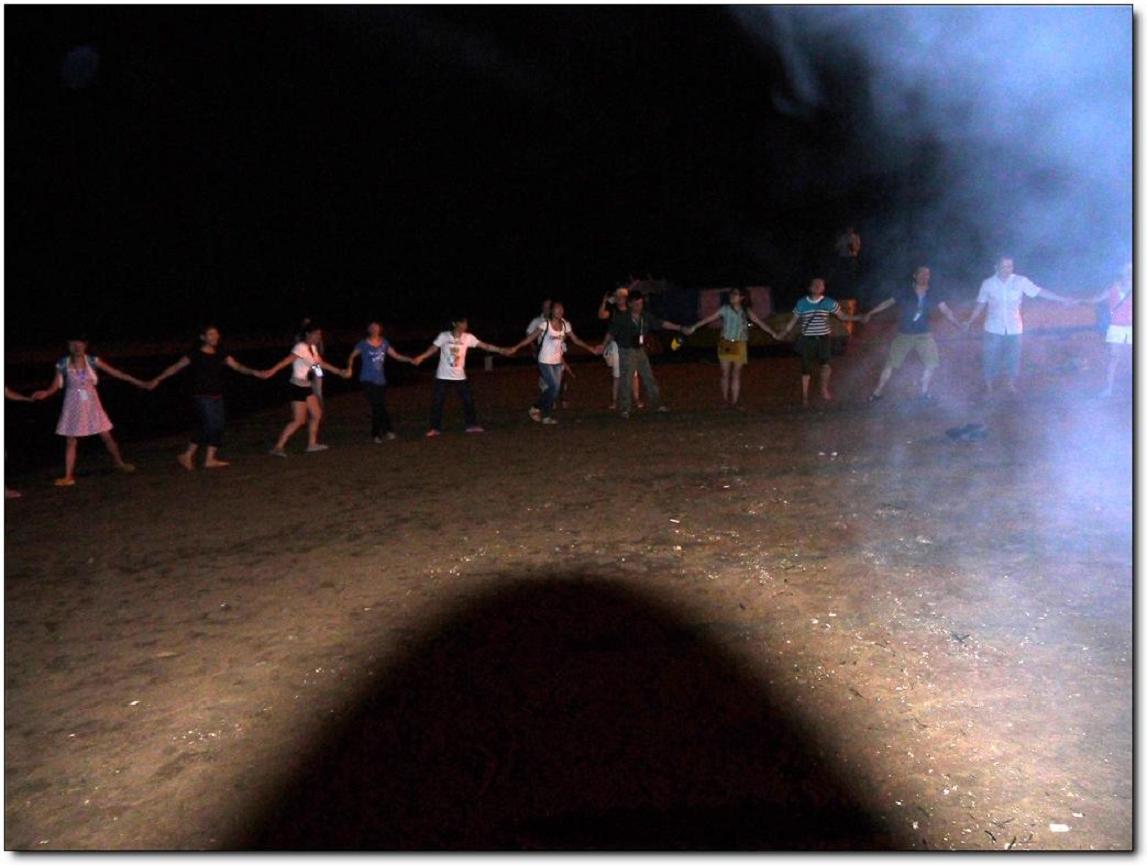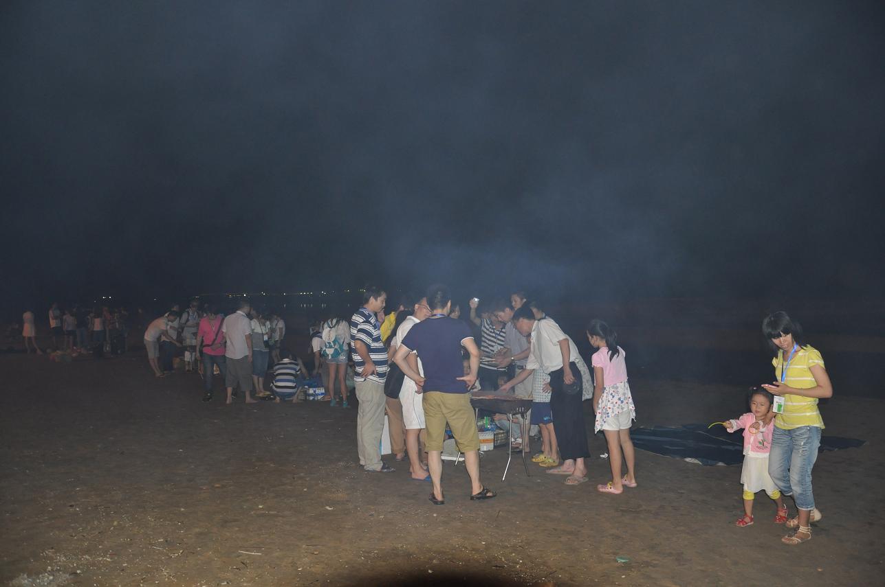 其實(shí)真正好玩的應(yīng)該是晚上吧,一開(kāi)始是圍著準(zhǔn)備著晚餐,吃完以后就是一個(gè)似乎沒(méi)有什么創(chuàng)意卻讓大家都很開(kāi)心的節(jié)目---篝火晚會(huì)。其實(shí)這種大家都圍坐在篝火前玩著簡(jiǎn)單但有懲罰的游戲,吃著零食,聊天的感覺(jué)還真的是很不錯(cuò).雖然會(huì)被煙吹的流眼淚,但篝火把每個(gè)人的臉都烤的紅紅的,而寒冷的海風(fēng)也似乎消失了。守夜的篝火已燃到第二把,深夜海上的寒氣催促著我們的臉。躺在黏黏的防潮墊上,聽(tīng)著海的咆哮,那巨大的聲響好似要把我吞沒(méi)?;炭种心枪上滔痰臍馕对诒乔痪従徲问帲媸莿e有一番風(fēng)味。接下來(lái)就是燒烤了,有的同事在海邊戲水正酣,有的同事那邊熊熊的燒烤爐已經(jīng)點(diǎn)燃,香滑雞翅、可愛(ài)的士豆、清香的玉米、清甜的韭菜、肥肥的茄子,紛紛上陣,哇哇哇、真是讓人忙不過(guò)來(lái),不知先吃哪樣才好。但我還得接受炭火的“炙烤”不斷鍛煉自己的燒烤技巧,我們吃著喝著玩著,長(zhǎng)大了又何妨?我們的心還年輕著呢!就在這時(shí)一片海灘只聽(tīng)見(jiàn)海浪與我們的歡笑聲。